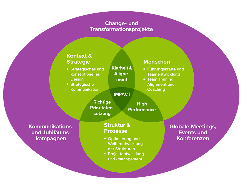 Wir stärken und unterstützen Führungskräfte und Teams als vertrauenswürdige Berater, Impulsgeber und engagierte Teamplayer, Trainer und Coaches. Wir unterstützen Veränderungs- und Transformationsprojekte, orchestrieren globale Meetings und Events und entwickeln wirkungsvolle Kommunikations- und Jubiläumskampagnen. Gemeinsam mit unseren globalen und agilen Fachexperten helfen wir Unternehmen, ihren Erfolg zu steigern und Werte zu schaffen, indem wir auf ihren eigenen Fähigkeiten und Ressourcen aufbauen und diese optimal ergänzen und weiterentwickeln.